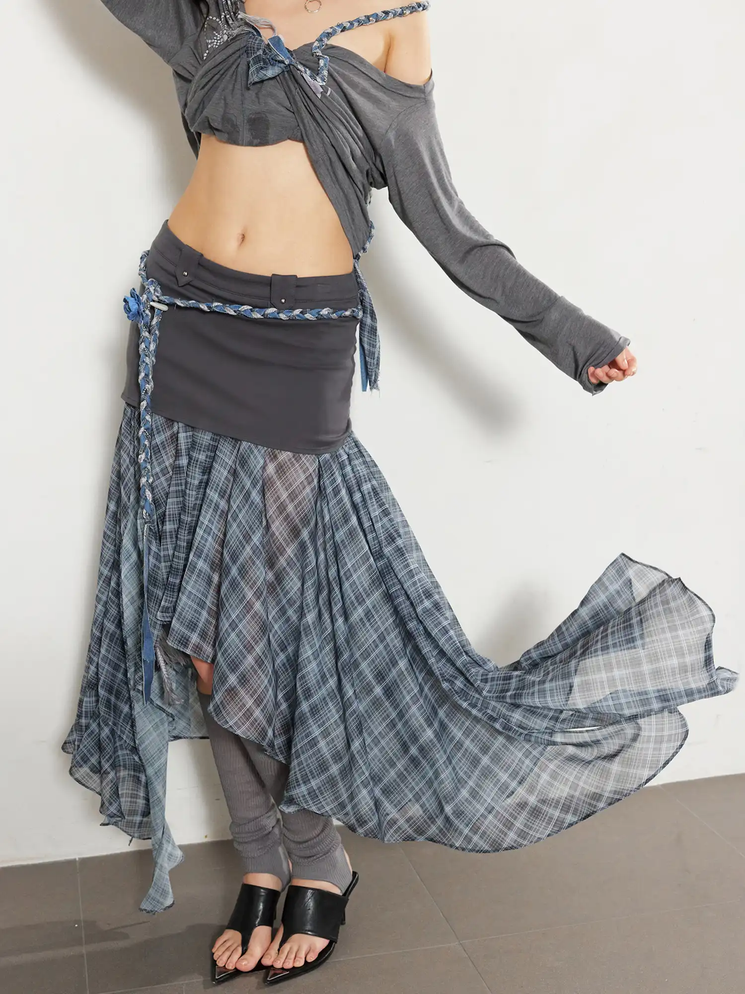 A soft chiffon midi skirt with an asymmetric drape, plaid mesh layers, and a breezy flow. Perfect as a chiffon midi skirt, plaid asymmetric skirt, lightweight summer skirt for a romantic and effortless edit.