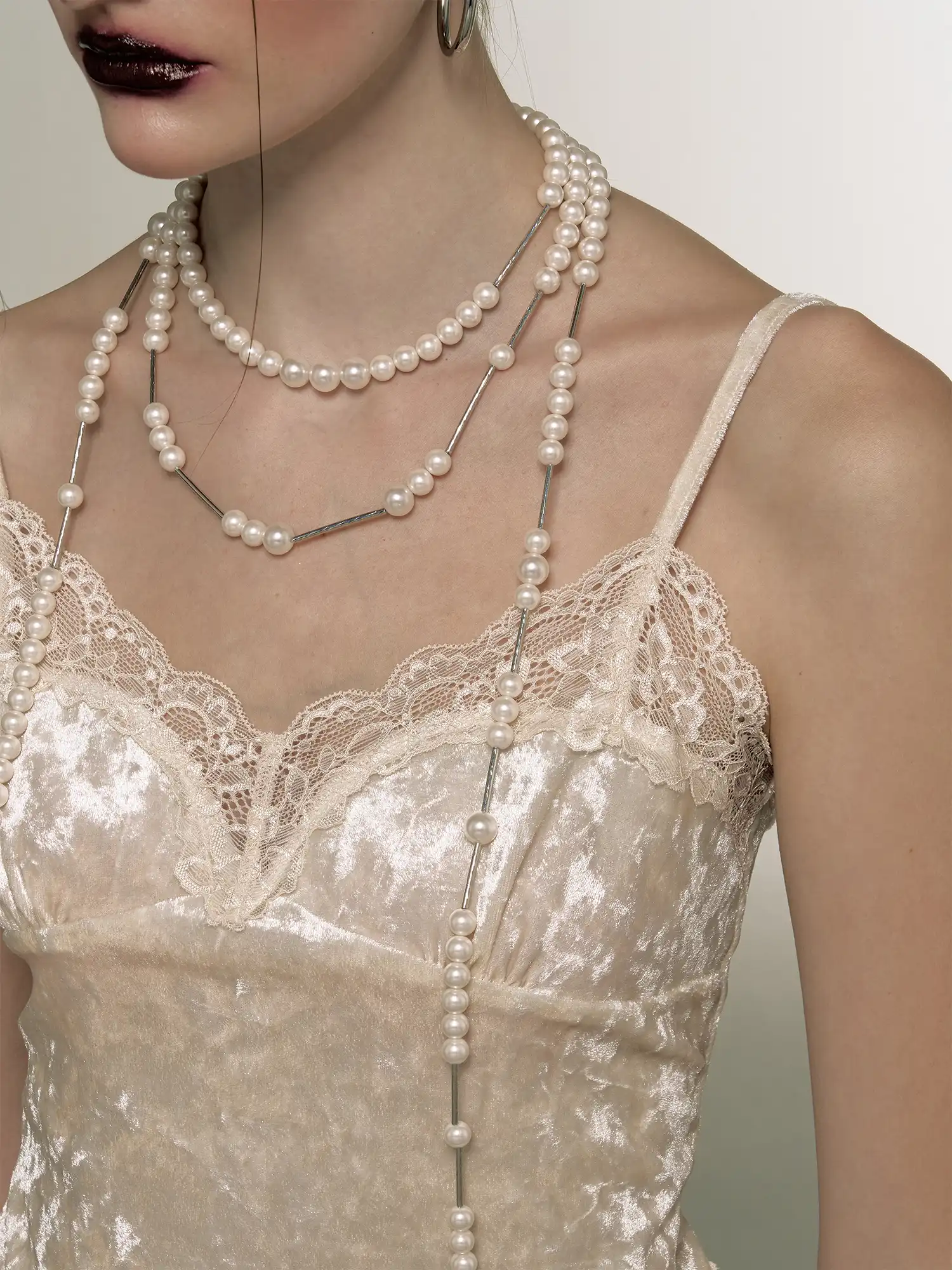 Crafted for layered styling, this dual-strand pearl necklace flows into a drop pendant with a delicate cross. Great for multi-strand pearl layering looks, statement vintage sweater necklaces, or refined feminine jewelry.