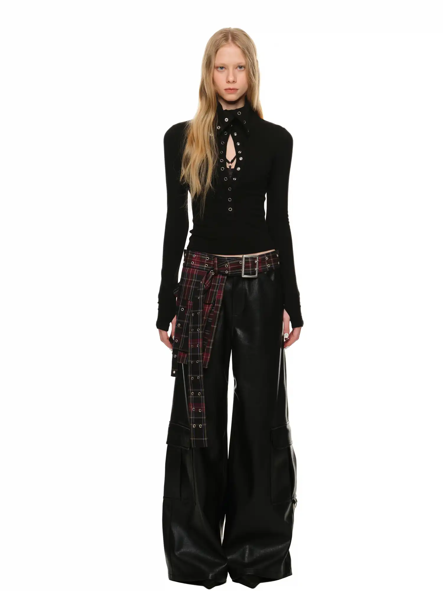 Edgy lace up high neck sweater featuring dramatic grommet details and gothic styling. This fitted long sleeve top offers stretch fabric comfort with bodycon silhouette. Perfect winter knit sweater for those who love alternative fashion and statement pieces.