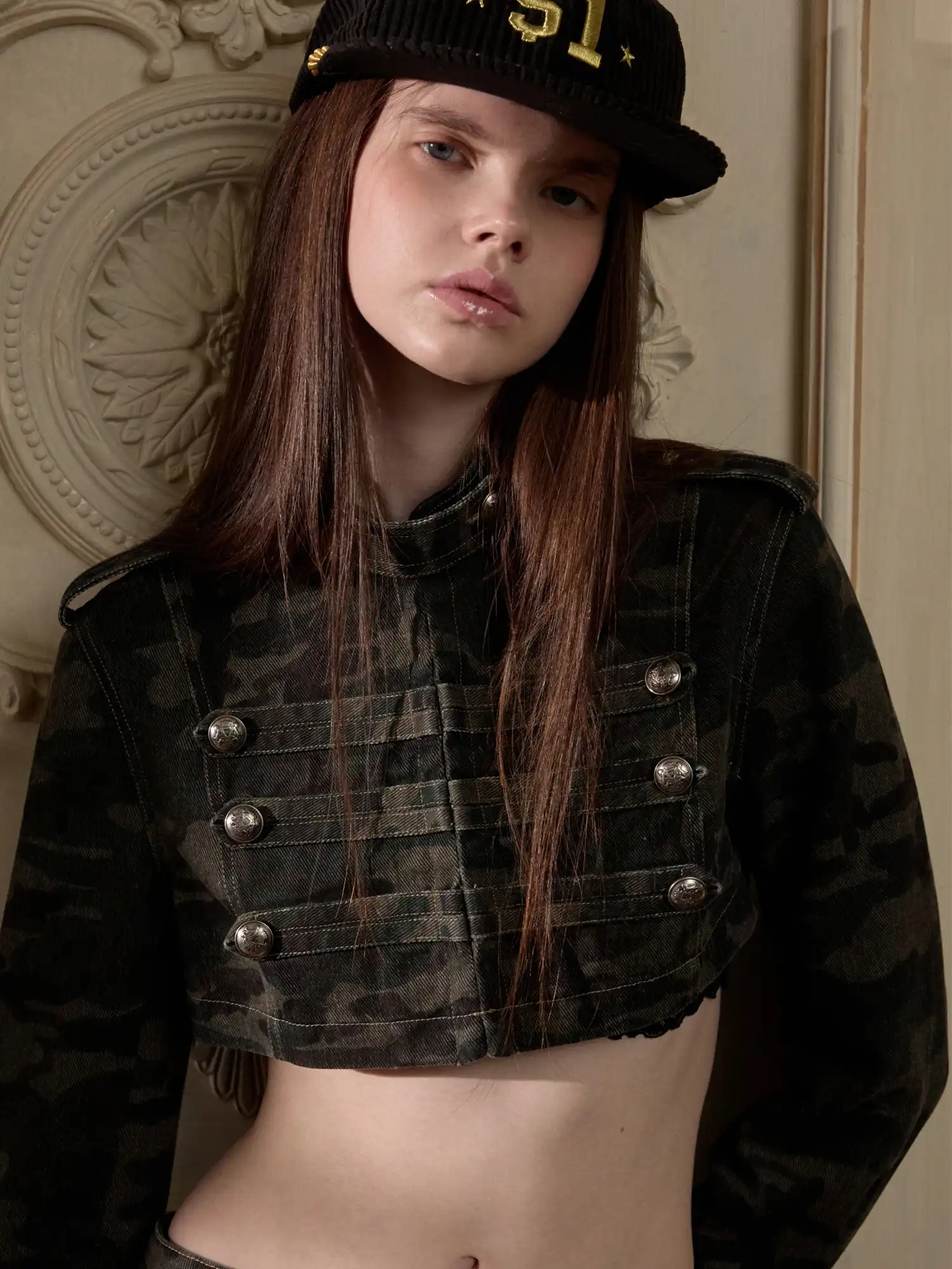 A structured Y2K Napoleon ultra crop jacket featuring double-breasted button detailing and camo denim canvas fabric.Designed with a sharp military silhouette and ultra-short length to accentuate the waist.