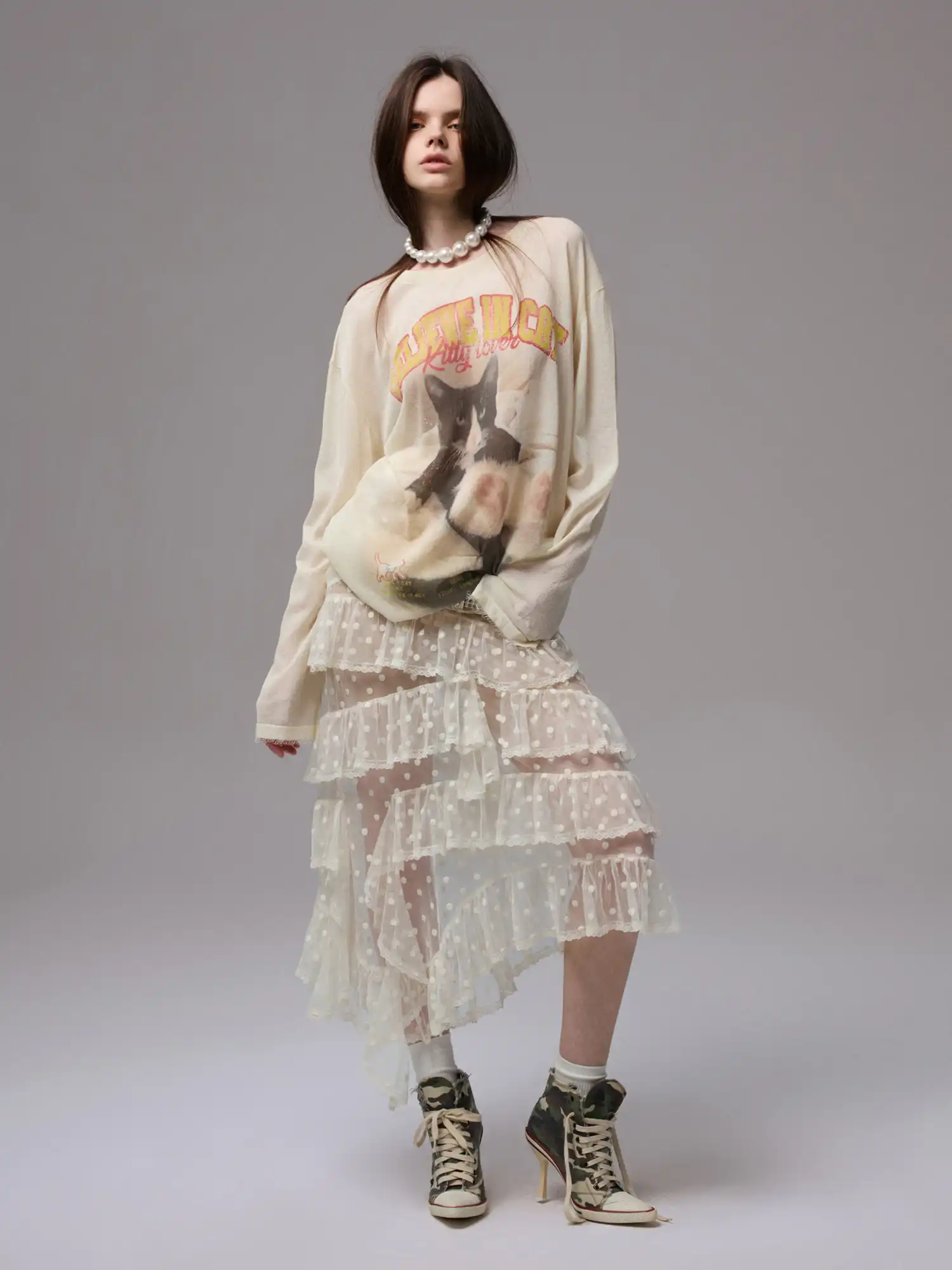 Create romantic vintage charm with this vintage polka dot cake skirt featuring tulle mesh layered construction. This women's ruffle A-line skirt showcases tiered dot pattern with voluminous silhouette. Perfect sweet style midi skirt for feminine occasions.
