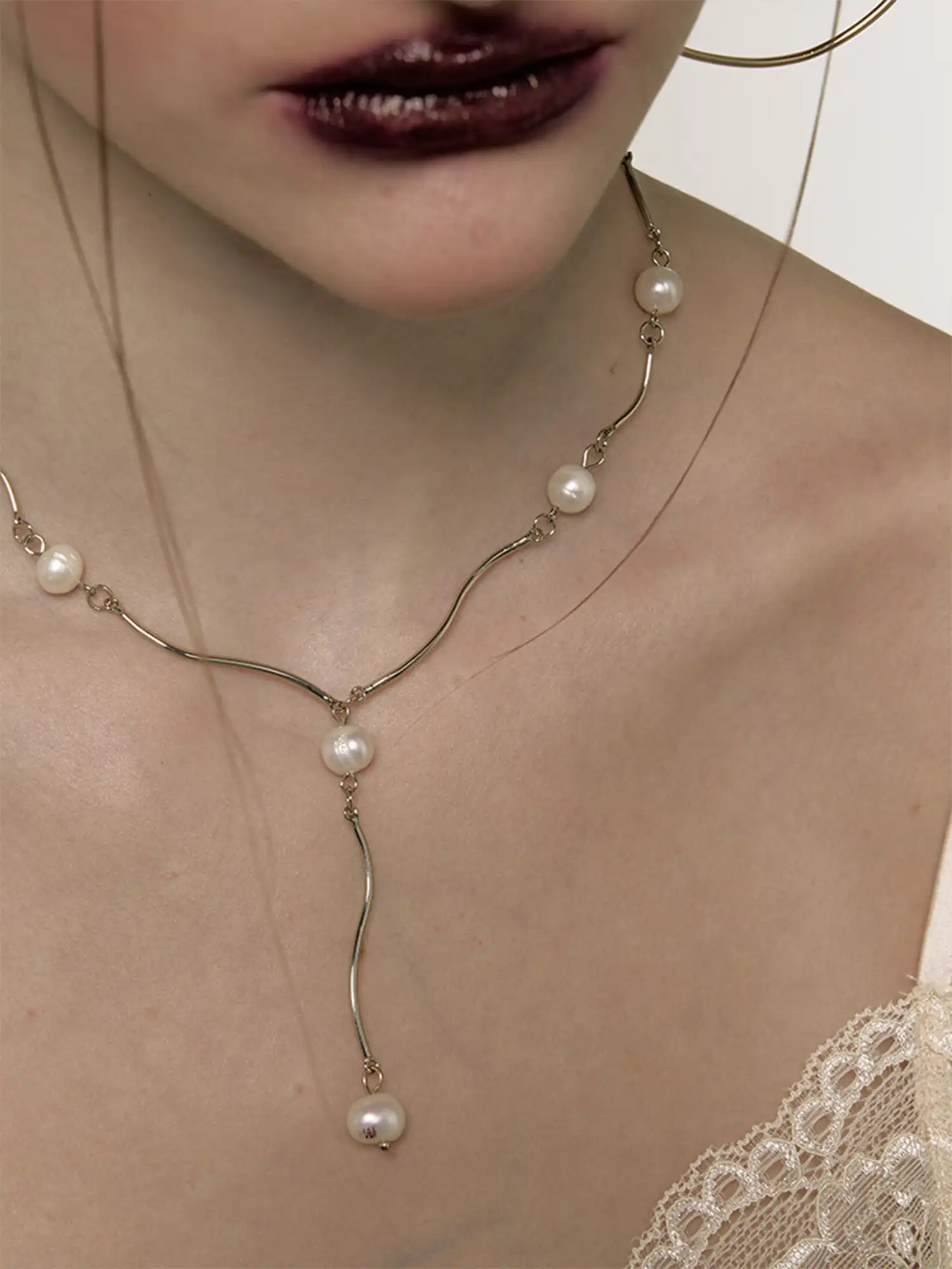 Sculptural serpentine curves meet freshwater pearls in this minimalist Y-style design. For fans of wavy gold necklaces, irregular pearl choker jewelry, and light luxury vintage-inspired accessories.