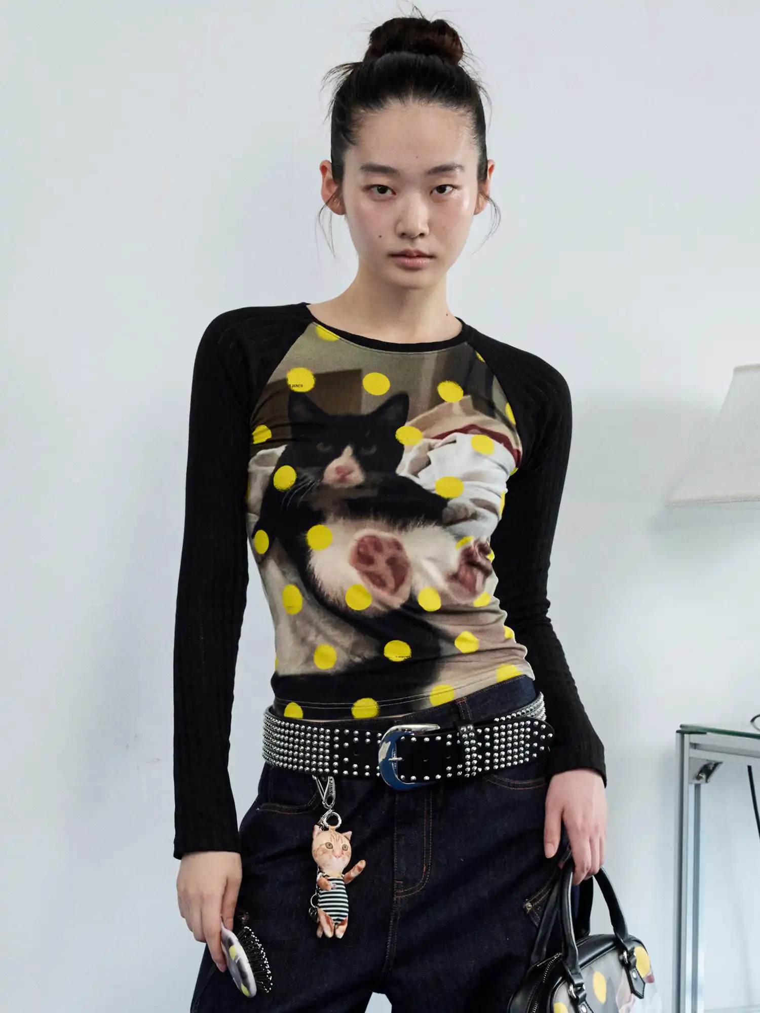 Express quirky personality with this cat graphic raglan tee featuring black contrast knit and long sleeve top construction. This statement piece offers retro cat imagery with bold color blocking. Perfect street style essential for vintage lovers and alternative fashion with playful sophistication.