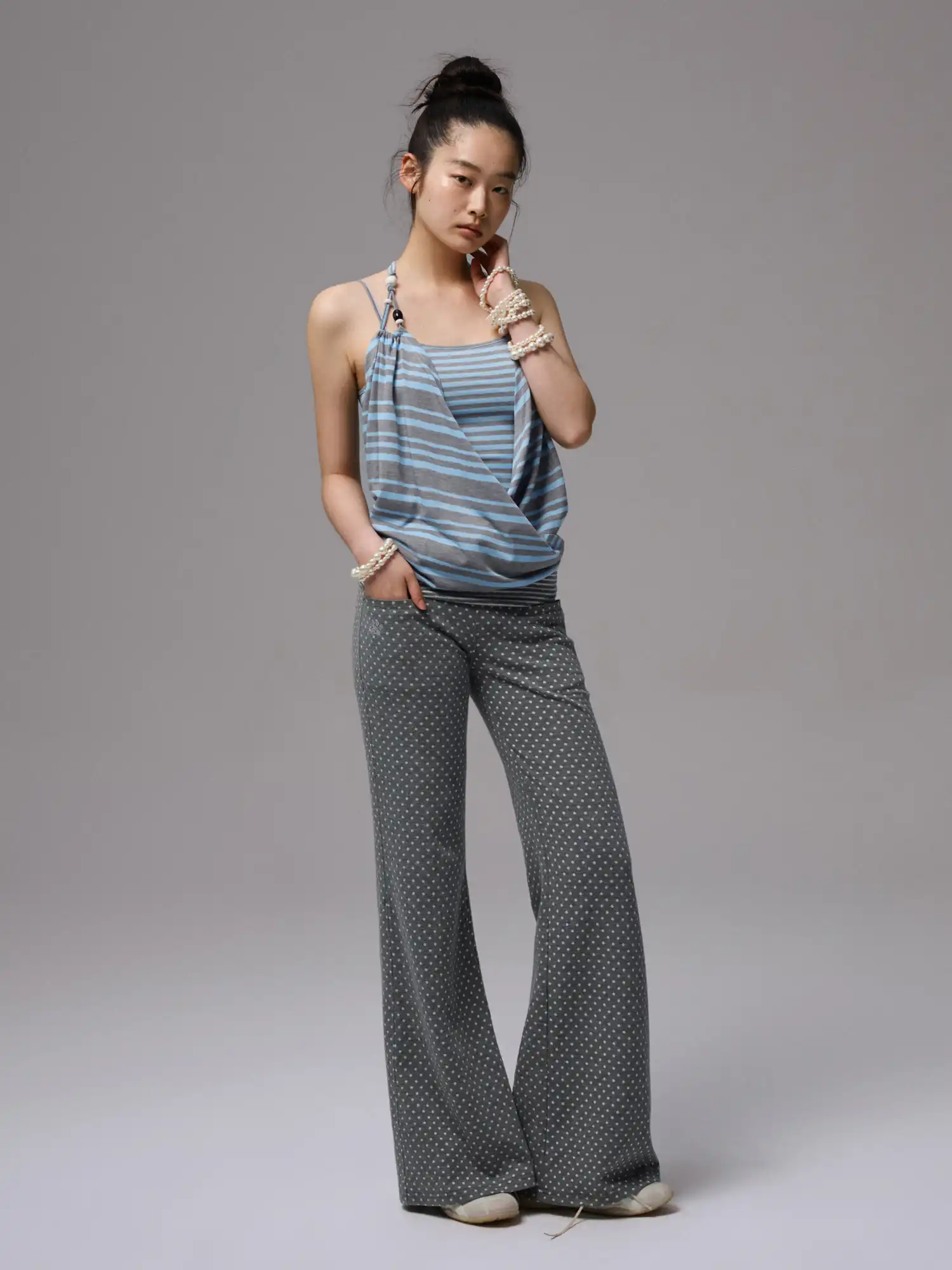 Create sophisticated layering with this halter tank featuring blue stripe pattern and beaded detail accents. This camisole top offers faux layered styling with fitted silhouette. Perfect summer essential for elegant casual and refined beach fashion with nautical charm.