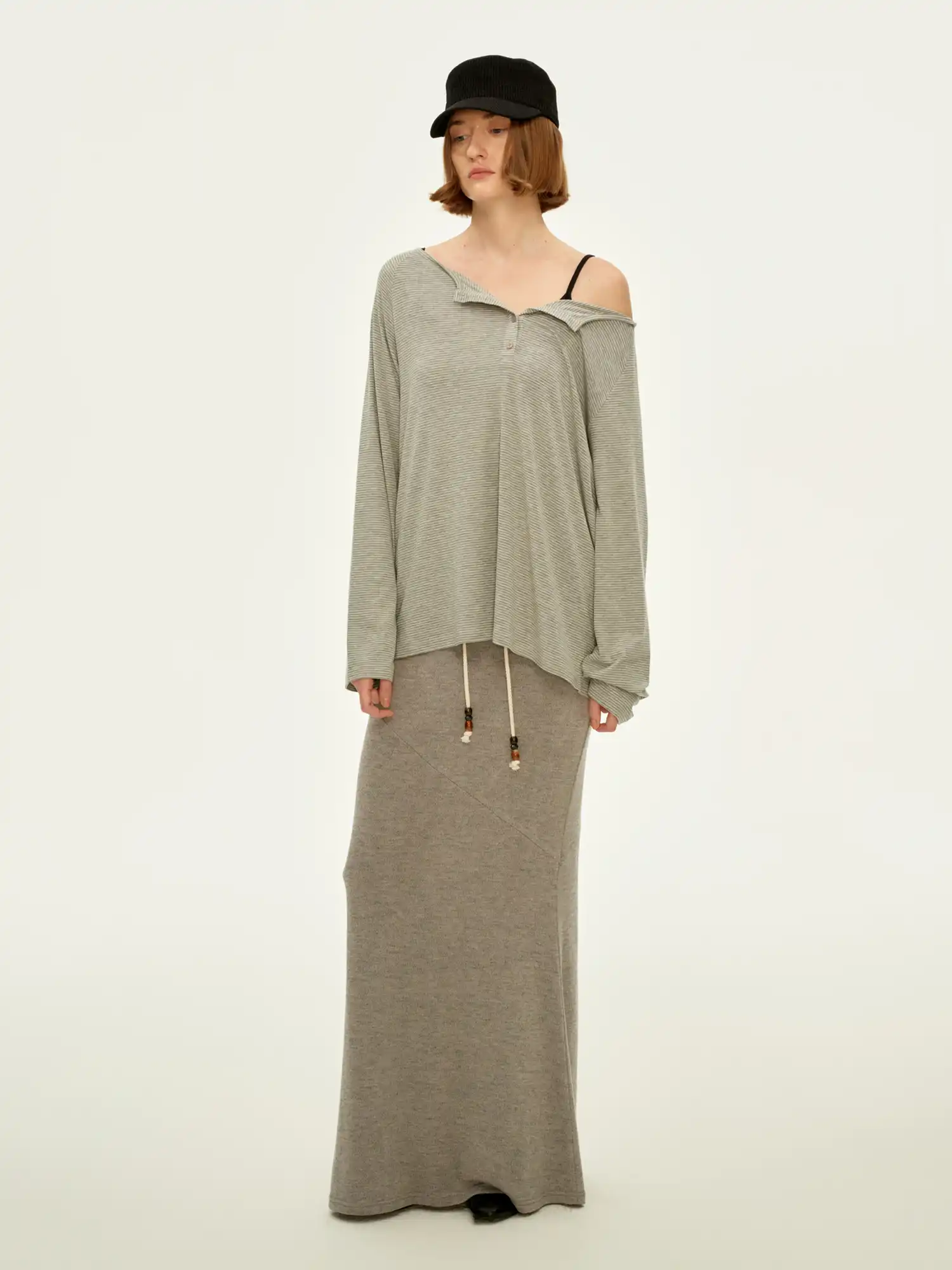 Channel deconstructed elegance in this stripe shirt with off shoulder oversized styling and asymmetrical details. This casual blouse delivers contemporary comfort with minimalist stripe aesthetic. Essential designer-inspired top for sophisticated casual wear.